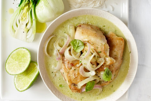 Fragrant with coconut, ginger and shallots, this brightly flavoured curry is best served over jasmine rice or rice noodles. Fresh cilantro or basil leaves make a pretty garnish and add an extra layer of flavour. Serve with braised bok choy for the perfect simple Thai supper.