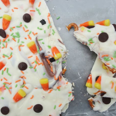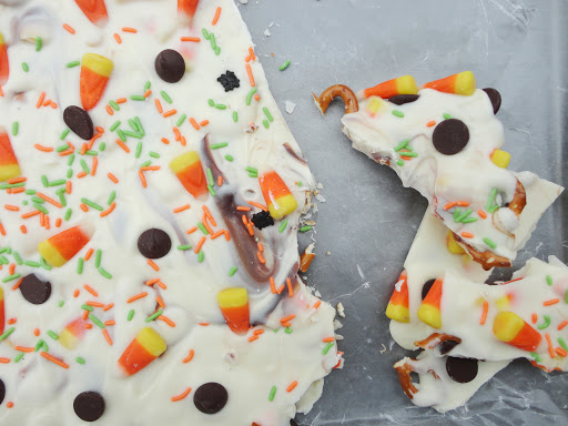 Once the bark is fully melted, pour onto the cookie sheet and spread across all of your candy pieces. Scatter the remaining candy corn on top and decorate with sprinkles. Let it set in the fridge for about 10 minutes or until firm. After it’s set break the bark into small chunks to serve.
