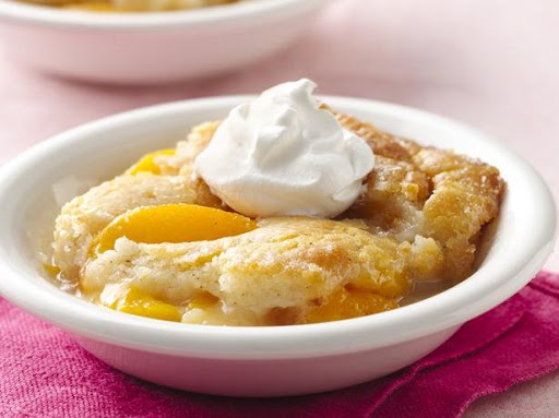 Stir together Bisquick mix, milk and nutmeg in ungreased square baking dish, 8x8x2 inches. Stir in butter until blended. Stir together sugar and peaches; spoon over batter.