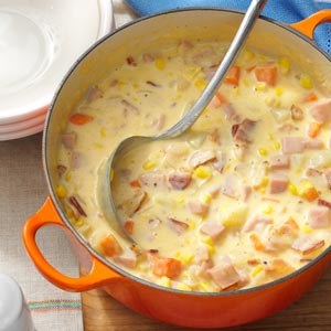 Add the potatoes, corn, bouillon and pepper. Reduce heat; simmer, uncovered, for 20 minutes or until potatoes are tender. Add cheese and ham; heat until cheese is melted. Stir in bacon. Yield: 10 servings.