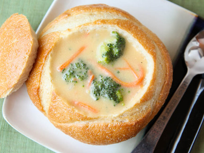 3. Cut a circle in to top of each Sourdough Boule and hollow out the inside of each loaf. Spoon 1 cup of soup into each bread bowl and serve immediately.
