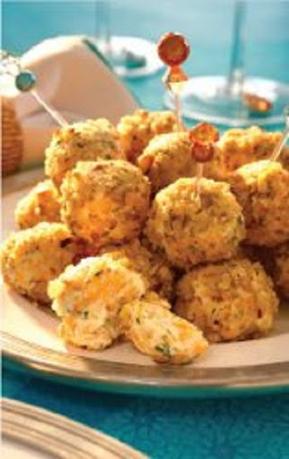 •Spread the chopped walnuts on a plate. Shape the cheese mixture into 35 to 40 small cheese balls, each about the size of a large marble. Roll each cheese ball in the walnuts, coating the outside (you may have to press a little to ensure sticking).
