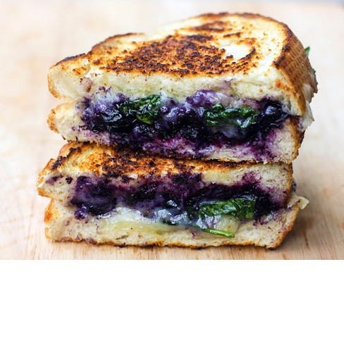 Spread blueberries onto a piece of bread, top with cheese, some spinach, then more cheese! Sprinkle with fresh ground pepper. Top with your other slice of bread and toast.