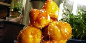 2. Put the sugar with 1/2 water in a saucepan, dissolve, and boil to caramel (340°F). Dip the choux balls into the caramel and arrange in a circle. Continue dipping and build the balls up like a stone wall, preferable around an oiled cone (or flowerpot) to make a big tree. Spin some of the extra caramel around the tree. Set aside until ready to serve.