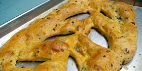 3. Punch down the dough and roll into a thin rectangle, using a rolling pin. Place on a baking sheet (you can scatter cornmeal underneath if you like). Cut three slits down each side, to give the bread a leaf look. Separate the slits with your fingers to make long holes. Let the bread rise a half hour. Meanwhile, heat the oven to 400°F/200°C.