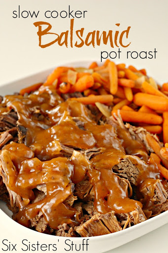 Cover roast with carrots, onions, and celery. In a bowl, mix together balsamic vinegar, tomato juice, beef broth, garlic, thyme, and sage. Pour over the roast. Place 2 bay leaves on top and cover with lid. Cook on low for