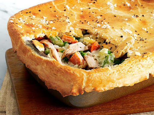 Transfer the filling to a 2-quart casserole dish. Roll out the dough on a lightly floured surface until about ? inch thick and slightly larger than the dish. Beat the reserved egg white in a bowl; brush over the dough and season with salt and pepper. Press the dough against the sides of the dish. Place on a baking sheet and bake until the crust is golden brown, 20 to 25 minutes.