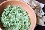 Open the avocados, slicing them lengthwise, remove the pits and slide the meat out of the skins into a large serving bowl.