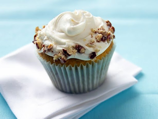 Mmm! Toasted and sugared nuts top cream cheese frosting on sweet and spicy pumpkin cupcakes