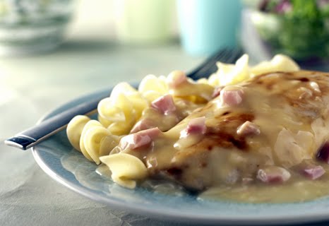 2. Stir the soup, water, wine, cheese and ham in the skillet and heat to a boil. Reduce the heat to low. Cover and cook for 5 minutes or until the chicken is cooked through. Serve the chicken and sauce with the noodles.