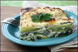 Spray an 8" X 8" baking pan with nonstick spray. Evenly place 1/3rd of the cooked zucchini strips on the bottom. With a spoon or spatula, spread half of the ricotta-veggie mixture on top. Evenly top with 2 lasagna sheets, followed by 1/3rd of the sauce.