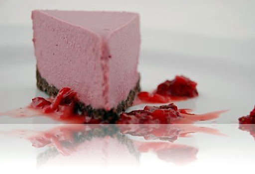 “The Cheesecake that started it all! When Vanessa Sherwood posted her White Chocolate-Strawberry Cheesecake on the forum she got everybody salivating and obsessing over cheesecakes, begging for more! This beautiful pink and red creamy sweetness is light on the nuts and fat and as fresh and healthy as can get with cheesecake, and still be rich and delicious.” – Indulge