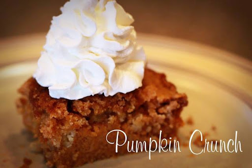 Sprinkle cake mix on top of pumpkin mixture and pour melted butter over top.