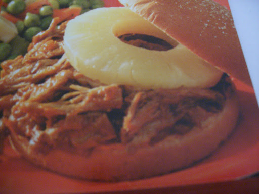 Shred meat w/ two forks; return to slow cooker and heat through. Spoon 1/2 c. onto each bun; top w/ a slice of pineapple.