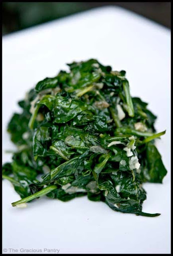 1. In your largest saute pan, heat the oil over high heat until very hot, almost smoking. Add the spinach and cook, stirring furiously, for about 1 to 2 minutes, the spinach should turn bright green and wilt slightly. Add the garlic and continue to cook, stirring rapidly, for 30 seconds.