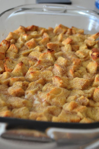 Heat oven to 350, grease a 9x9 or 9x13 casserole dish. Pour bread mixture into the pan and bake for about 50 minutes. Checking before the 50 minutes are up. When done the top will be brown and a knife inserted into mixture will come out clean.