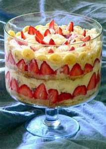 Prepare pudding with milk. Cut cake into cubes and place 1/2 in bowl, 1/2 pudding, 1/2 banana slices, 1/2 strawberry slices/ 1/2 cool whip. Repeat.