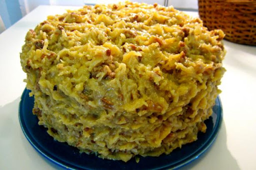 Spread the coconut-pecan between each of the layers, and then over top and sides of whole cake.