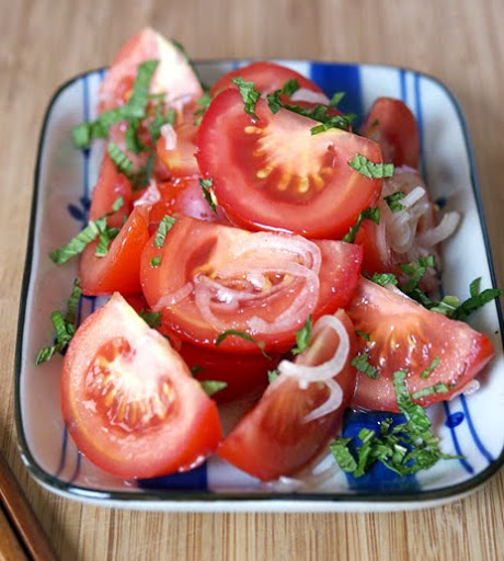 3. In another small bowl, mix together the cider vingar and fish sauce with the remaining 2 teaspoons of sugar and the remaining salt. In a large bowl, toss the tomatoes with the cider vinegar mixture and wilted shallots. Sprinkle the chopped mint on top and serve.