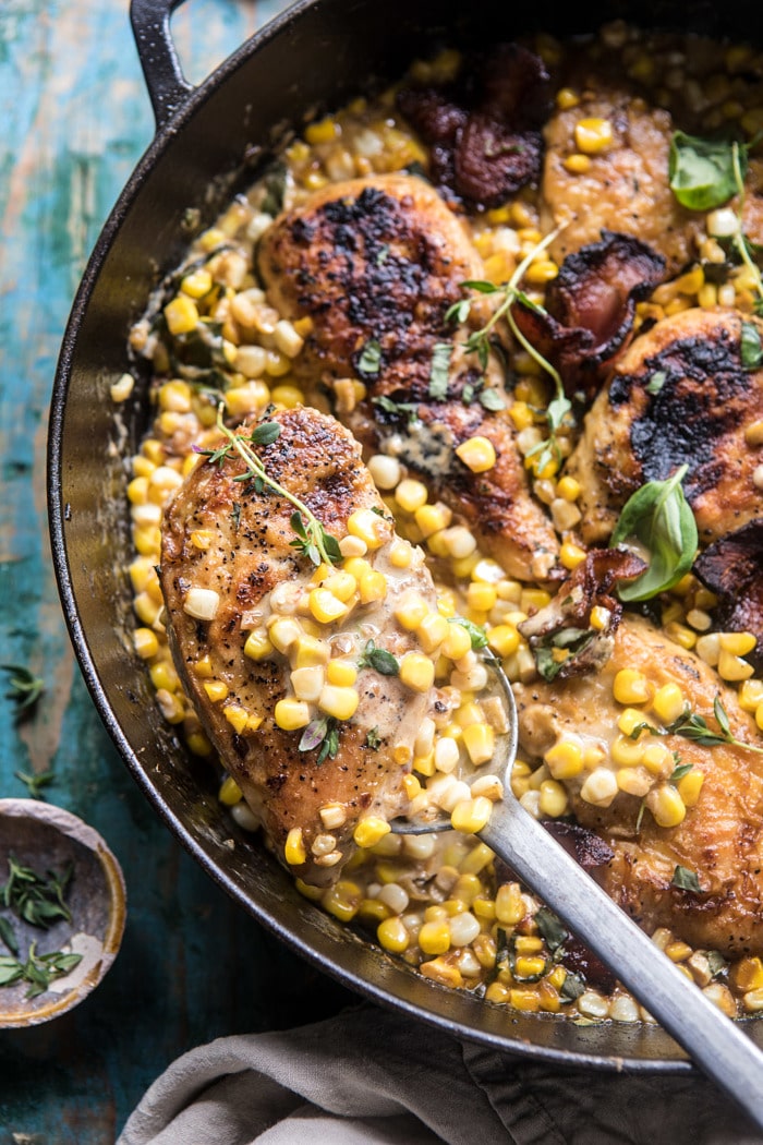 6. Serve the chicken topped with fresh thyme and basil. Enjoy!