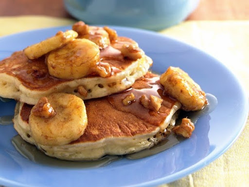 1. In 1 1/2-quart saucepan, melt butter over medium heat. Add walnuts; cook, stirring occasionally, just until walnuts and butter begin to brown. Add bananas; stir to coat with butter. Stir in syrup. Reduce heat to low; cook until warm. Keep warm while making pancakes.