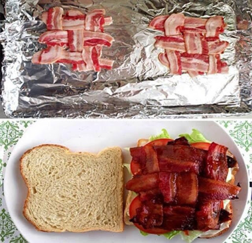 Overlap bacon in crisscross pattern as shown & bake on foil for BLT sandwich