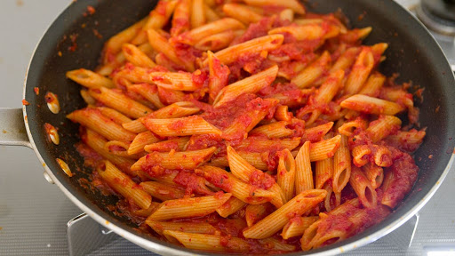 6. Combine sauce mixture with cooked penne and 1/4 to 1/2 c pasta water in saute pan