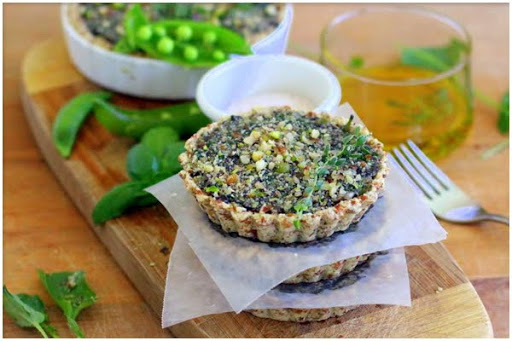 In the meantime, blend together the coconut meat and water, Irish moss, cilantro, curry paste, agave and salt in a high speed blender. When the vegetables are dehydrated, combine the mushroom and vegetable mixture together with the coconut blend in a food processor. Mix it, but don’t puree. Remove from food processor and set aside. Drain the dehydrated peas, and gently fold them into the mushroom mixture. Adjust the salt and spices. Pour the filling into the crust, let it set in the refrigerator for a little while and enjoy.