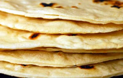 After dough has rested, one at a time place a dough ball on a floured surface, pat it out into a four-inch circle, and then roll with a rolling pin from the center until it’s thin and about eight inches in diameter. (If you roll out pie crusts you’ll have no problem with this.) Don’t over work the dough, or it’ll be stiff. Keep rolled-out tortillas covered until ready to cook.