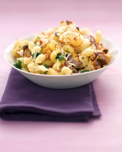 Preheat oven to 475 degrees, with racks in upper and lower thirds. Set a large pot of salted water to boil. On a rimmed baking sheet, toss cauliflower, onion, and garlic with 2 tablespoons oil; season with salt and pepper. Roast on lower rack until lightly browned and tender, 20 minutes, tossing once.