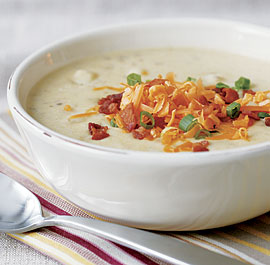 When the potatoes are cool, cut one of them in half lengthwise. Use a large spoon to scoop the flesh in one piece from each half. Cut the flesh into 1/2-inch cubes and set aside. Coarsely chop the potato skin and the entire remaining potato and add to the pot with the leeks. Purée the contents of the pot in a blender until very smooth (you'll need to work in two batches). Return the puréed soup to a clean soup pot and reheat over medium low. Whisk together the milk and sour cream until smooth and then whisk this into the soup, along with 1/2 cup of the Cheddar. Stir in the diced potato. The soup should be fairly thick, but if it seems too thick, thin it with a little water. Season to taste with salt and pepper. Serve garnished with the remaining Cheddar, the bacon bits, and the scallions or chives.