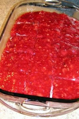 2. Pour 1/2 of jello mix into bottom of 9×13 casserole dish. Place in freezer for approximately 15 min until jello sets.
