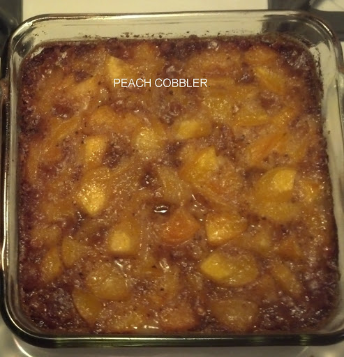 In a mixing bowl stir 1 cup cugar with peaches. Spoon peaches over cobbler mix.