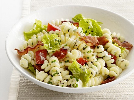 Mix the mayonnaise, sour cream and 3 tablespoons chives with the pasta until evenly combined. Season with salt and pepper. Add the lettuce; toss again to coat. Garnish with the reserved bacon and the remaining 1 tablespoon chives. Serve at room temperature.