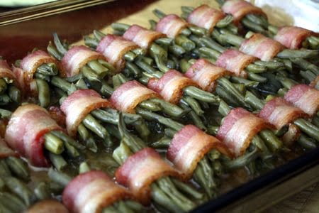 1. Wrap 5-8 beans in 1/2 slice of bacon and secure with toothpick. Place in large casserole dish.