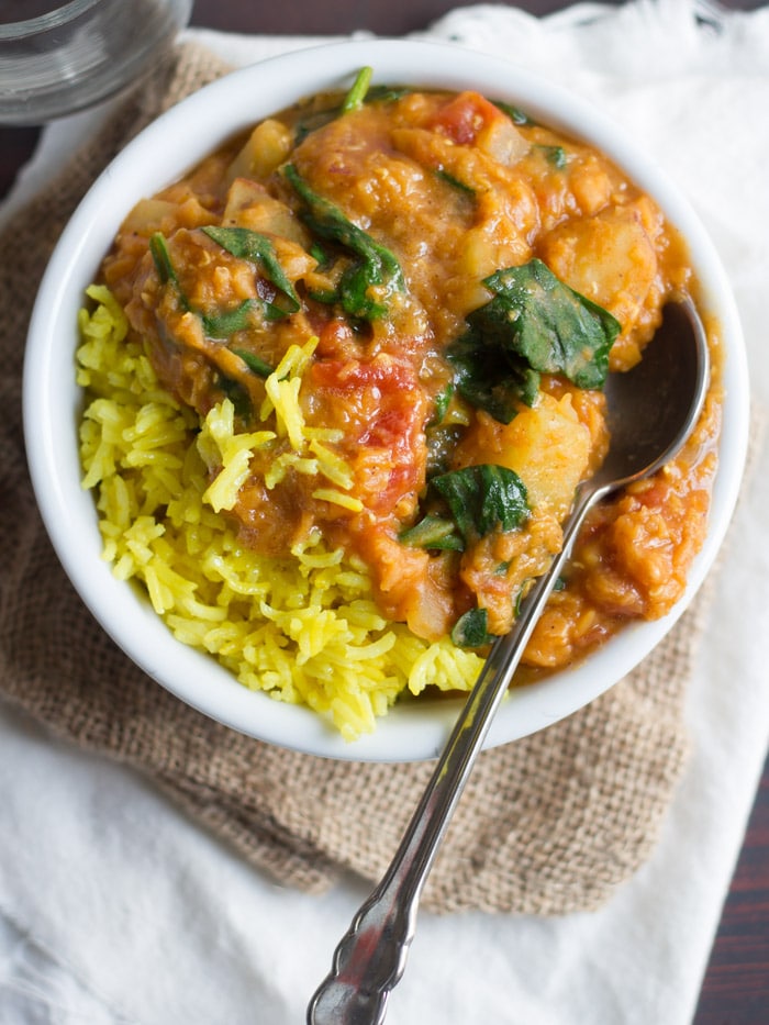 Add broth, lentils, tomatoes and potatoes. Stir a few times, raise heat and bring to a simmer. Lower heat and allow to cook until lentils are very soft and potatoes are tender, about 30 minutes. Stir in spinach and continue to cook just until wilted, about 2 minutes.