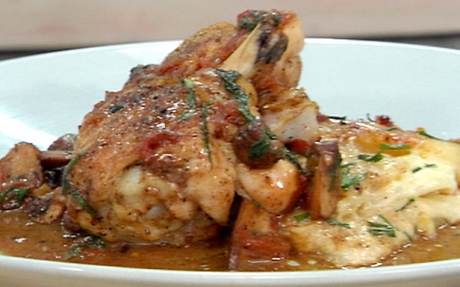 Blend together flour, oregano, salt and pepper. Set aside 1 Tbs. flour mixture and coat chicken with remaining mixture. In a heavy skillet, brown chicken in the butter and olive oil. Remove chicken to a platter. Add onions and saute until soft, about 5 minutes; add garlic and toss to brown for 1 minute. Return chicken to pan. Combine wine and lemon juice and pour over chicken. Bring to boiling, reduce heat, cover and cook over low heat for 40-45 minutes or until chicken is tender Meanwhile, in a small skillet cook mushrooms in the 2 Tbs. butter until tender; drain. Remove chicken to platter, keep warm. Add mushrooms, tomatoes, and sugar to wine mixture in skillet, cook until vegetables are tender, about 5 minutes. Blend together the reserved flour mixture and water, add to sauce. Cook and stir until thickened and bubbly. Pour over chicken on serving platter. Add parsley, if desired. Makes 4 servings.