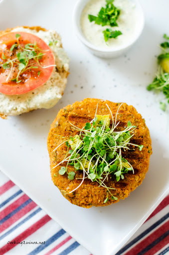 We didn't have a food processor strong enough to handle all of the ingredients, so we ended up mashing by hand. Not sure how much of an effect this had on the consistency of the patties, but they help up really well! The flour was definitely essential for keeping the ingredients together; however, I think I'll cut back on the amount of flour by a bit since the patties were quite a mouthful to chew! These are dense, dense patties that need the lightness of the yogurt sauce. I think they're probably best eaten without any burger buns as that would have just been too much starchiness to handle.