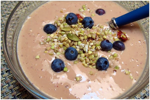 3. Top with fresh blueberries and some sprouted homemade granola or “Living Intentions” raw granola. It is super-b!