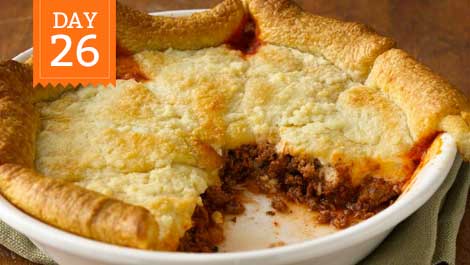 Pour hot beef mixture into ungreased 9 1/2 or 10-inch glass deep-dish pie pan or 11x7-inch (2-quart) glass baking dish. Spoon cheese mixture over beef mixture.