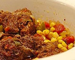 Place meat in the slow cooker. Add frozen corn, sweet pepper, onion, sugar, hot pepper sauce, and black pepper. Pour tomatoes over mixture in cooker.