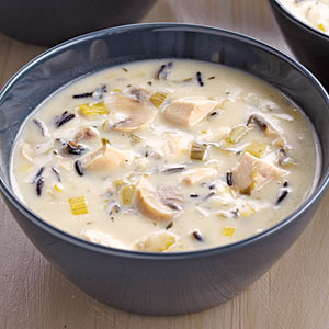 3. Weigh or lightly spoon flour into a dry measuring cup; level with a knife. Combine flour and 1 cup broth, stirring with a whisk until smooth. Add broth mixture to soup. Cook over medium heat 2 minutes or until slightly thick, stirring constantly. Reduce heat to low; add chicken, half-and-half, wine, and mustard. Cook 2 minutes or just until thoroughly heated (do not boil).
