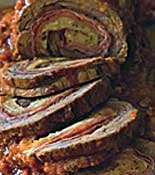 2.On a work surface, rub the flank steak with olive oil; generously season with salt and black pepper. Layer the ham, salami, mortadella and provolone, leaving a 1/2-inch border. Spread the reserved bread crumb mixture evenly over the provolone. Roll up the steak, jelly-roll style, to enclose the filling, then tie the roll in several places to secure the filling. Set aside.
