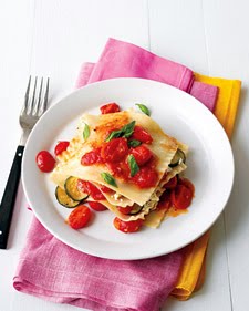 3.Place some tomatoes on four plates; top with a noodle and small spoonfuls ricotta, zucchini, and more tomatoes. Repeat layering twice, then top with remaining noodles and tomatoes. Garnish with basil.
