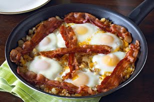 MAKE 6 small wells in potato mixture; fill with eggs. Top with bacon; cook, covered, 3 to 4 min. or just until eggs are set. Let stand, covered, 1 min.