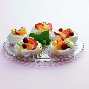 Bake at 275° for 45-50 minutes or until set and dry. Turn off oven and do not open door; leave meringues in oven for 1 hour. Spread cups with lemon curd and fill with fruit.