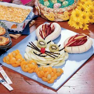 In the center of a large serving platter or 16-in. x 12-in. baking sheet covered with freezer paper, layer green apples in an 8-in. circle to make bunny's head.