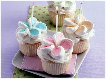 4 Using kitchen scissors, cut each marshmallow crosswise into 4 slices. Sprinkle slices with colored sugar. Arrange 5 slices on each cupcakes in flower shape. Place candle in center of each flower.