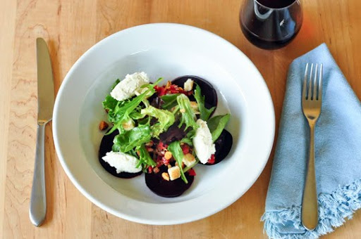 To Plate the Salad: Divide the slices of beet across 4-6 plates and arrange them in a single layer. Using a slotted spoon, add a scoop of the romesco sauce on top of the beets. Sprinkle a handful of bread cubes over top. Toss the greens with two tablespoons of leftover vinaigrette from the romesco sauce, and place a handful on top of each plate. To finish, add a few dabs of goat cheese around the edge of each plate and serve.