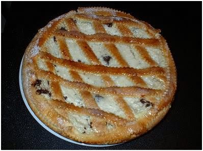 Preheat oven to 350. Butter and flour a 9" springform cake pan, then set aside. Roll out three quarters of the dough on a lightly floured surface into a round about 12" in diameter and 1/4" thick. Gently fold then fit it into bottom of cake pan, with 2"-3" of the dough coming up the side of the pan. Spoon in filling, spreading it evenly over dough. Fold pastry edges in over edge of ricotta filling. Roll out remaining dough to a thickness of about 1/4". Cut into 1/2"-wide strips. Decorate tope of cake with strips in a lattice pattern. Bake on a baking sheet in the middle of the oven until golden, 45-55 minutes. Remove _ from oven and let cool on a cake rack for 10 minutes. Sprinkle with confectioners' sugar before sugar.